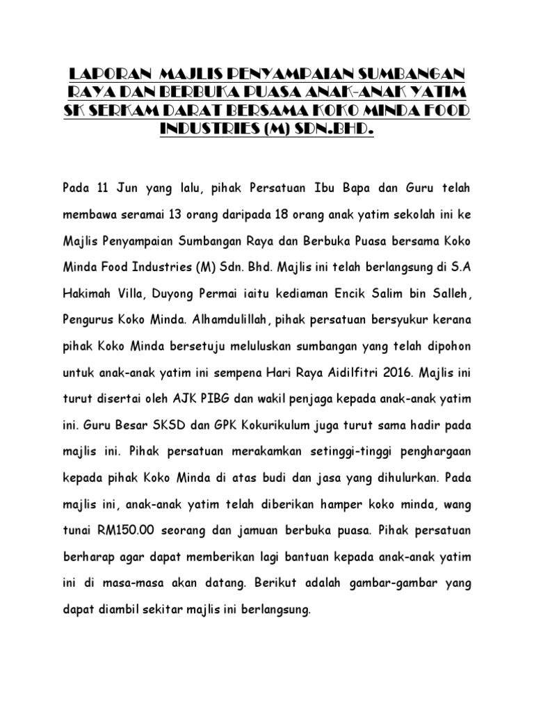 Laporan Penyampaian Sumbangan Raya Dan Berbuka Puasa Anak Anak Yatim Sksd Bersama Koko Minda Pdf